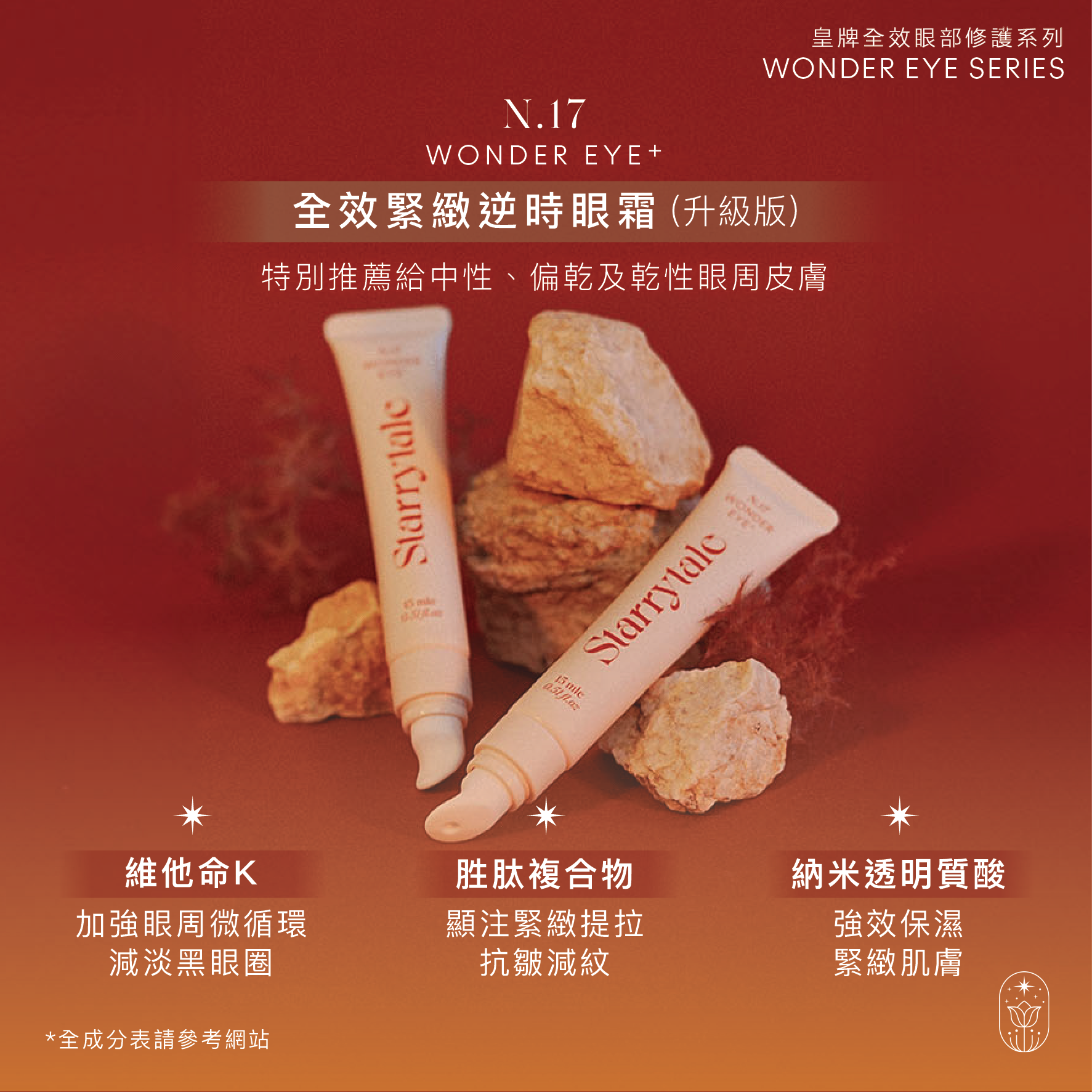 奧托玫瑰純露、勝肽複合物、奈米透明質酸、銅肽、維生素K、有機竹莖萃取物、有機摩洛哥堅果油、庫拉索蘆薈葉萃取物、荷荷巴油、維生素E、植物丙二醇、黃原膠、植物甘油, 金合歡膠, 卵磷脂, 乙基甲基纖維素, 乙基己基甘油